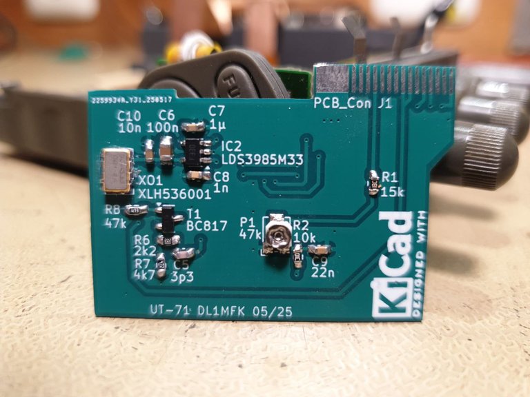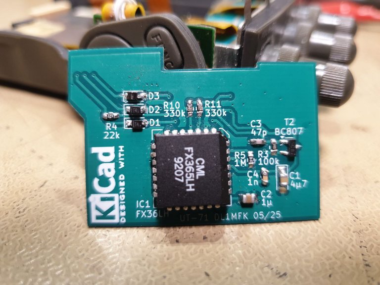 Peter OE7PKI hat in seinem Fundus noch ein Dreiband Icom IC-Delta 1E ohne Subtone-Platine. Weder UT-70 noch UT-71, also mit leerem Steckplatz. Im Netz ist sowas auch seit Jahren nicht mehr zu finden. Also frisch ans Forschen, und mal geschaut, ob sich irgendwo noch ICs finden lassen. Der Baustein der dreifach verbaut ist, ist ein FX365LG mit 24 Pins. Die Einzigen die zu bekommen und zu finden sind, sind im PLCC-28 Gehäuse, für die kein Pinning irgendwo existiert. Der Rest ist mit zweifelhaftem Aufdruck. Ins kalte Wasser gesprungen und bestellt. Mit dem Signatur-Schreiber ließ sich das Rätsel bald lösen. Also mit KiCad ein Projekt erstellt und eine Platine geordert. Bis auf einen Fehler im Bestückungsdruck (in den KiCad-Files behoben) war alles in Ordnung.
