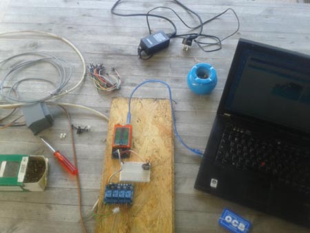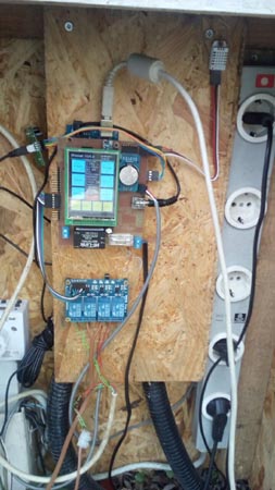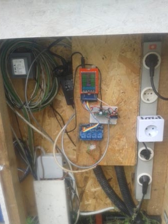 Die Schaltuhr die zuvor das mit der Steuerung übernommen hatte ist noch zu sehen. Auf dem Steckbrett sind die einzelnen Module noch aufgesteckt, und die 4-fach Relaiskarte ist inzwischen mit einer zusätzlichen doppel-Relaiskarte erweitert worden. Hierbei ist noch zu sagen, daß die interne Spannungsversorgung aus dem Arduino-Board nicht ausreicht um alle Komponenten zu versorgen ohne irgendwann aufzugeben. Es empfiehlt sich ein extra 5V-Netzteil zu verwenden.