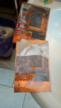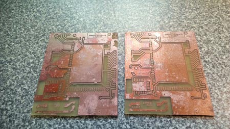 Nach zufriedenstellenden Ergebnissen musste eine Platine her, die alle Module, bis auf die Relaiskarte beheimatet. Da nur zwei dieser Platinen grad notwendig waren (ein Freund wollte das unbedingt auch so wie ich mir das eingebildet hatte), sind die einfach nur mit der Tonertransfer-Methode hergestellt worden: