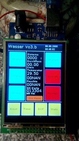 Der Füllungsgrad der Zisterne wird über einen Ultraschall-Sensor erfasst und in Liter umgerechnet. Der Durchflußmengenzähler ist gerade so an der Grenze von dem was hier benötigt wird: 60l/min. Hatte mich bei den ersten Messungen ziemlich Überrascht was denn da so an Wasser durch die Leitungen flieẞt. Da aber nicht alles zu jeder Zeit gegossen wird, reicht der Zähler gut aus.