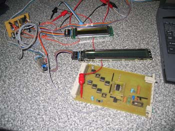 Sollte der 19" Träger mal ohne Spannungsversorgung sein wird der I²C-Hauptbus mittels einem Relais freigeschaltet, damit der I²C-Bus der ja mit anderen 19"-Trägern verbunden ist nicht "tot" gelegt wird. Durch die Anzeige ist die Frontplatte etwas breiter, und damit ist nun noch Platz hinter der Anzeige noch zusätzliche Funktionen zu verstauen. Konkret steckt dort ein Bus-Expander, der entweder zum Schalten von 8 Leitungen verwendet werden kann oder beim RX-Baugruppen-Träger als Zustandsmelder der Empfänger Video-Rauschsperren. Etwas Platz ist dort noch ... vorgesehen vielleicht noch für ein extra 5V Schaltnetzteil oder oder ... :-)