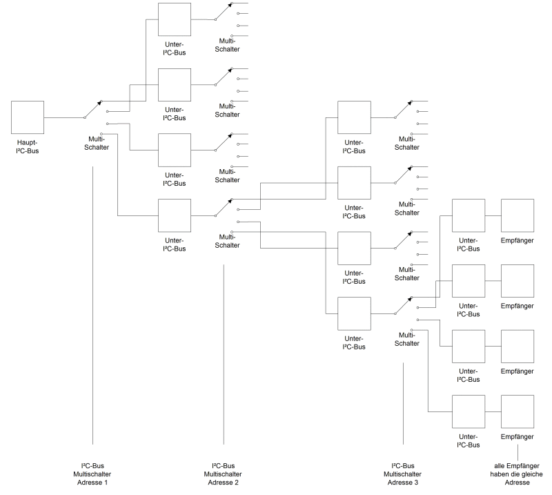 Geräte die mehrfach vorhanden sind wie Sender, Empfänger und Temperaturfühler verschwinden quasi hinter einem oder mehreren Multischaltern, die diesen Bus nur bei Bedarf nach außen verbinden. Somit ist es möglich je Multischalter bis zu 8 Geräte mit gleicher Adresse bereit zu stellen.