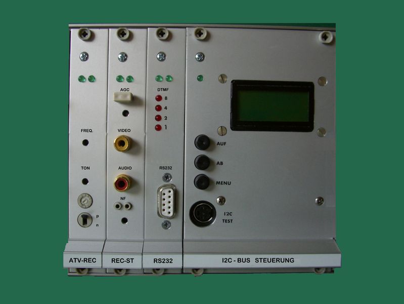 Die Empfänger hat sie zwischenzeitlich ein paar Mal geändert, ist jetzt PLL-stabilisiert, sowohl die HF als auch der NF-Träger, ebenso ist die Videopolarität ist fernsteuerbar. Auf der Steuerplatine befindet sich der Prozessor der diese Aufgaben erledigt. Weiter sind Verstärker für Video und Audio vorhanden, um an der Frontplatte auch das Video messen zu können. Die Feldstärke sowie Audio-Pegel wird gemessen und von einem weiteren Prozessor an das OSD-Modul weitergereicht. Der Steuerprozessor findet seine Daten im FRAM, der Prozessor der das OSD-Modul anspricht wird direkt über I²C angesprochen.