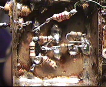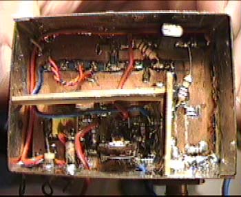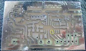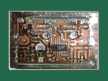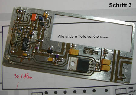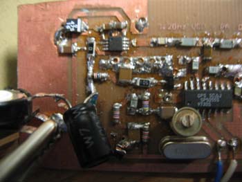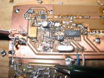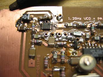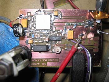 Zu sehen ist hier links die Unterseite des Steuersenders mit Oszillator und PLL (SP5055). Die PLL wird hier näher beschrieben