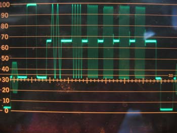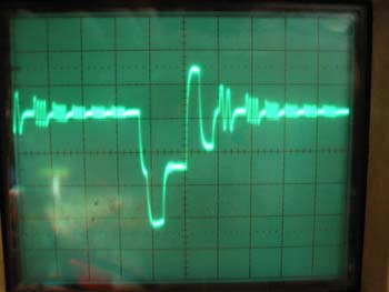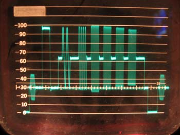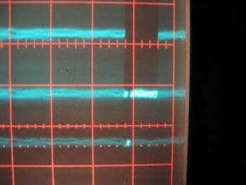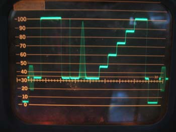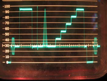 Die Oszillogramme stammen nun vom ungefilterten aber mit De-Emphase versehenen Ausgang eines Satro-Empfängers. Diese Empfänger liefern wirklich ein klasse Signal, auch bei den Kommerziellen TV-Programmen. (Da natürlich nur in den Prüfzeilen zu sehen)