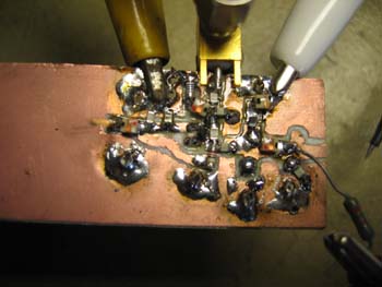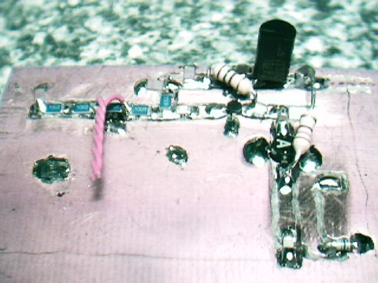 Das war der erste 13cm Steuersender den ich erfolgreich nach eiiiiiinigen Versuchen auch zum Laufen brachte. Hier ist nur der Oszillator abgebildet. Das Grundmodell (von DJ8ES) ist in den UKW-Berichten zu finden. Prima Sache, weil dieser Oszillator ohne viel Aufwand herzustellen ist, nur mit der Messung was aus dem Teil rauskommt war's nicht so einfach. Glücklicherweise hatte ich einen Spektrumanalysator als Dauerleihgabe und auch einen Arabsat-Konverter, der das 13cm-Band in das 23cm-Band abbildet. Damit war auch der gewünschte Arbeitsbereich schnell eingestellt.