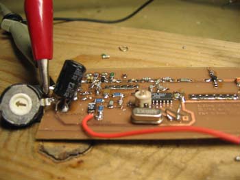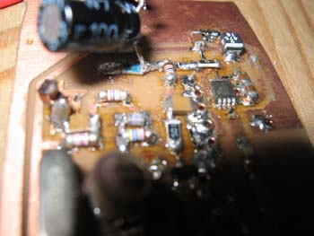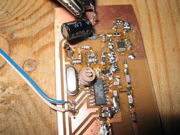 Der "dicke" Elko ist für die Videoeinkopplung in den MAX2754-VCO zuständig und soll später gegen ein Tantal-C ausgetauscht werden.