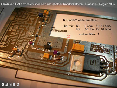 Der VCO mit dem MAX2754 ist soweit fertig. Was noch fehlt, ist eine erprobte Leistungsregelung. Aber wahrscheinlich ist das bequemer lösbar über die Arbeitswiderstände der MMICs.Hier ist die Bastelanleitung.