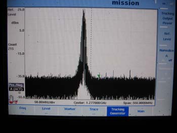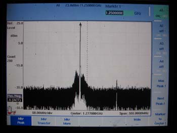 aber nun mit eingebauter Endstufe kommen angenehme 23dBm an der Antennenbuchse heraus. Das unmodulierte Spektrum sieht so aus: