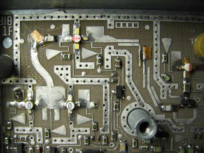 Eine Anmerkung noch zur Empfindlichkeit, um diese noch ein wenig zu steigern hab ich bei verschiedenen dieser LNCs genau an diesen Stellen kleine Fähnchen angebracht. Diese bewirken eine gleichmäßigere und höhere Durchgangsverstärkung von 10-11,5 GHz.