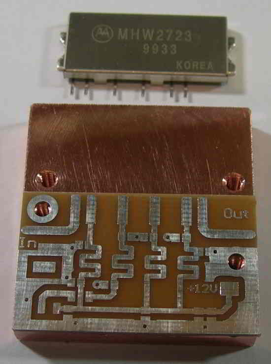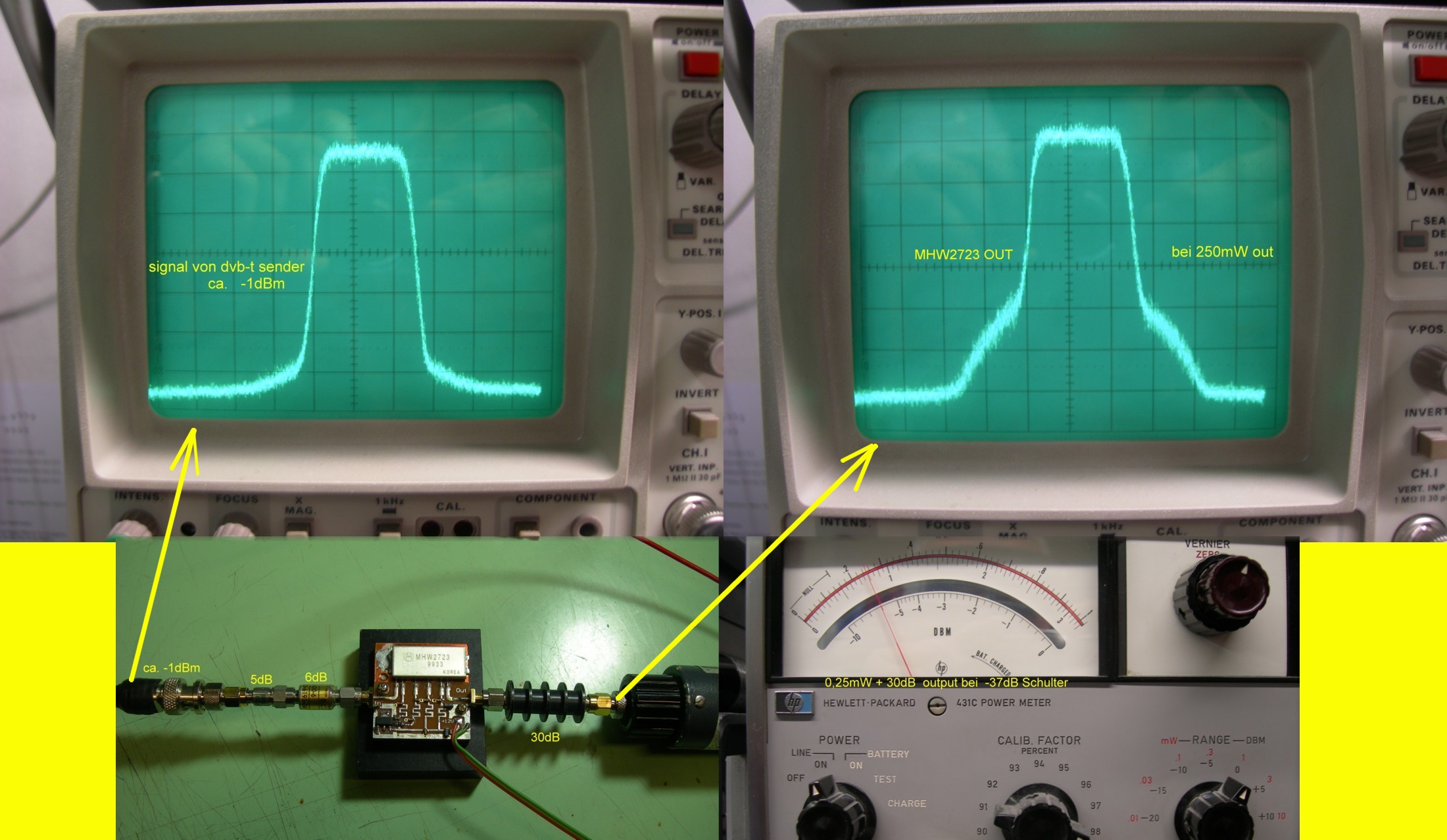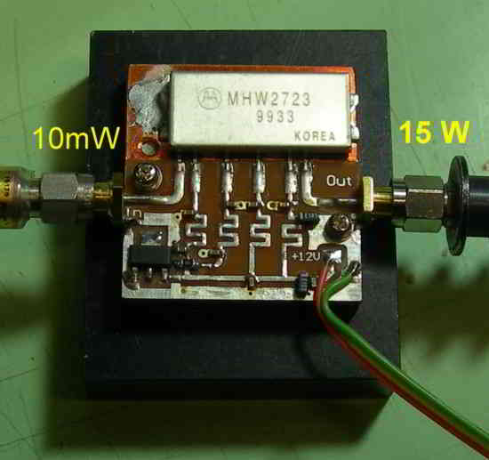Ein Breitband Verstärker für relativ wenig Geld ( MHW2723), der immer wieder in ebay angeboten wird. Frequenzbereich -3dB 243MHz bis 463MHz , bei 435MHz und einen 10mW Input ergibt 15W Output ( FM Signal ). Stromverbrauch bei 15W output ist 2,4A und bei 5W output ist 1,5A.
