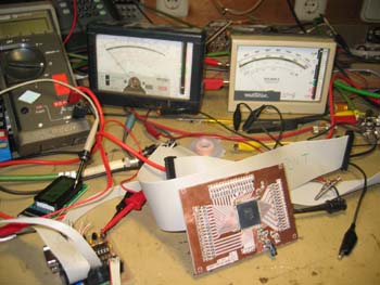 Um dieses Teil zu steuern hab ich den ATMEGA8 mit meinem Testboard verwendet. Die Software ist hier als Bascomfile und als Hex-File. die PIN-Belegungen finden sich im Bascomfile. Bis jetzt ist die Soft nur in der Lage das 112Bit Datenwort an den Chip zu übertragen und die Schaltungszustände werden über ein 2x8 Zeichen LCD ausgegeben. Aber als Grundlage sollte es einstweilen genügen ...