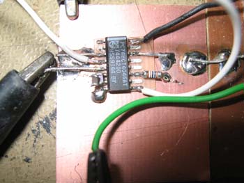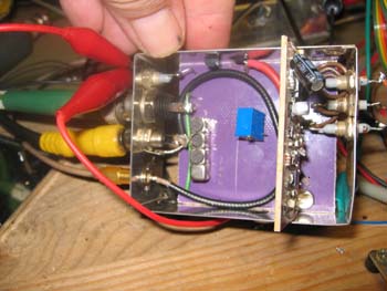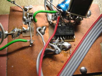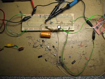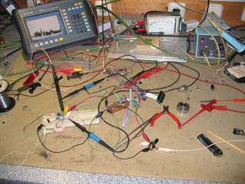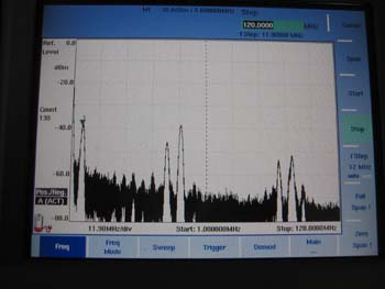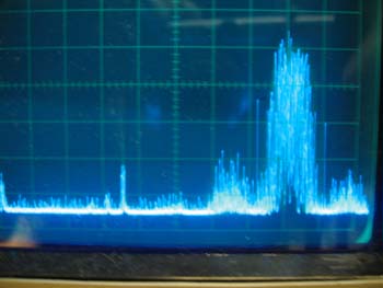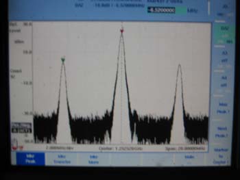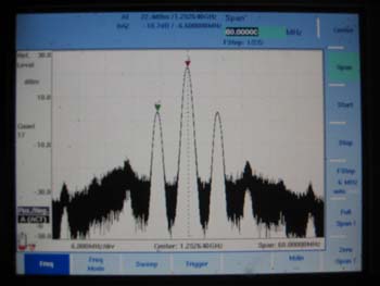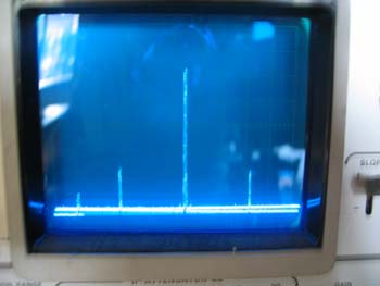 In den ersten Aufbauten auf den Steckbrett gingen schon die Grundfunktionen. Aber es waren einige Dreckeffekte zu beseitigen die wilde Spektren erzeugt haben. Der Aufbau auf einfachem Platinenmaterial brachte dann die gewünschten Ergebnisse. Endlich ein sauberes Spektrum und ein weiter Variationsbereich. Der neue Aufbau sah im Spektrum dann so aus: