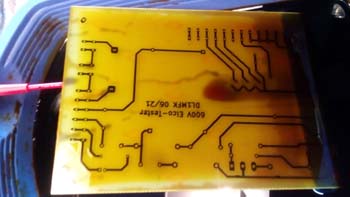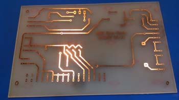 Mein Durchbruch war statt dem Bügeleisen einen Laminator mit beheizten Rollen zu verwenden. Seit dem gelingt der Übertrag von Laserdrucken auf glänzendem Fotopapier auf die Rohplatine. Nach dem Laminieren die Platine einfach in kaltes Wasser legen und dann sieht man schon wie sich das Layout abzeichnet, und das Papier durchgeweicht ist. In diesem Fall ist es nur einseitig und mit wenig Masseflächen.